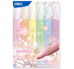 4 darabos Deli Macaron kiemelő tollkészlet, univerzális vízbázisú tintával, minden típusú papírra ideális. Ajánlott tárolási helyzet: vízszintes. Vonalvastagság: 5 vagy 1 mm.